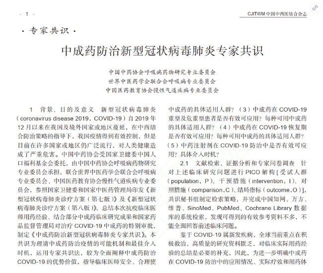 2022年3月5日,《中成藥防治新型冠狀病毒肺炎專家共識(shí)》正式在《中國中西醫(yī)結(jié)合雜志》網(wǎng)絡(luò)首發(fā)。