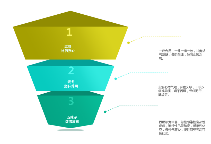 本方中紅參補(bǔ)氣為主,麥冬養(yǎng)陰偏寒,有清的作用,五味子收斂補(bǔ)肺氣的作用?,F(xiàn)代的生脈飲的主要成分人參為什么成了紅參?其實(shí)紅參就是人參的炮制品,通過炮制去其陰柔之性,增強(qiáng)其溫補(bǔ)的作用,配在方中,適合氣弱血虛的病人長期服用。